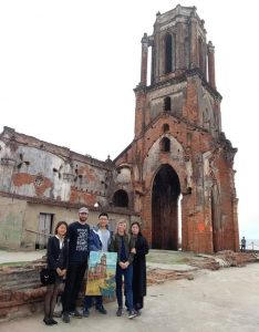 Filming at Hai Ly ruined church and beach and interviewing the artist who drew about the church.